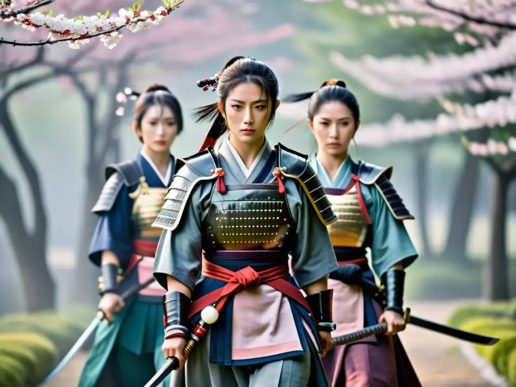Mujeres samurái desafían roles en armadura, con flores de cerezo de fondo, expresan determinación y fuerza