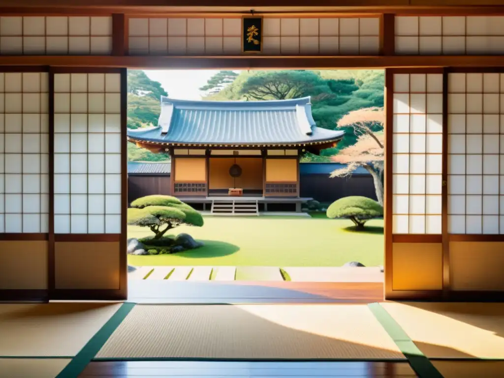 Un jardín japonés tradicional con un dojo al fondo, donde estudiantes practican artes marciales bajo la guía de un sensei